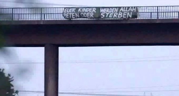 Chills were sent across Sindelfingen, Germany, after someone hoisted a banner reading “Your children will pray to Allah or die” onto an autobahn overpass.