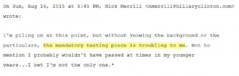 After a few more suggestions regarding other aspects of Clinton’s plan to combat drug abuse, campaign press secretary Nick Merrill wrote: ‘I’m piling on at this point, but without knowing the background or the particulars, the mandatory testing piece is troubling to me. Not to mention I probably wouldn’t have passed at times in my younger years … I bet I’m not the only one.’”