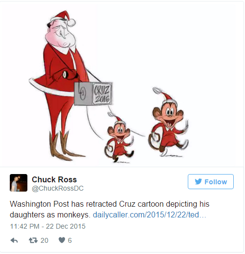 The logic on the left is amiss when one can justify hurting two young girls in order to hurt a Presidential candidate. Ann Telnaes wrongly concluded that it was appropriate to hurt Ted Cruz’ girls, by depicting them as monkeys in her cartoon, because Cruz had decided to use them in his own Christmas parody video.